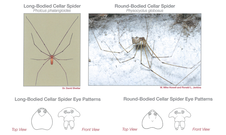 The adult female long-bodied cellar spiden Pholcus phalarigioides, has a body measuring 1/3 inch long. Of the 40 U.S. pholcid species, arguably it is the most frequently-encountered cellar spider in buildings. Often this species is referred to as a “daddy long-legs” by the general public; however this common name contributes to confusion with the garden daddy—long-legs or harvestmen of Order Opiliones, which are not spiders. The round-bodied cellar spider, Physocyclus globosus, and short-bodied cellar spider, Spermophora meridionalis, are smaller (bodies 3/16 inch and 1/10 inch long, respectively) and occupy buildings as well.