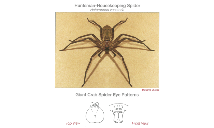 A few species of giant crab spiders occur in North America north of Mexico. The huntsman or housekeeping spider, Heteropoda venatoria, is common in Florida; the golden huntsman spider, Olios fasciculatus, occurs in the West and Southwest.