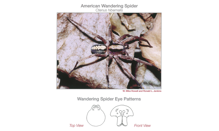 About 550 species of wandering spiders occur worldwide in the tropics and subtropics; but the American wandering spider (a.k.a. Florida false wolf spider), Cterius hibernalis (possibly synonymous with Ct. captiosus), is the one representative found in and around homes built in wooded areas throughout peninsular Florida. It is large, dark brown and has a broad pale, full-length central pale to yellowish stripe. Two genera of wandering spiders that sometimes make their way into the U.S. from Central and South America, hiding in bunches of imported bananas and other cargo shipments, are Cupiennius (harmless or of questionable concern) and Phoneutria (potentially dangerous).